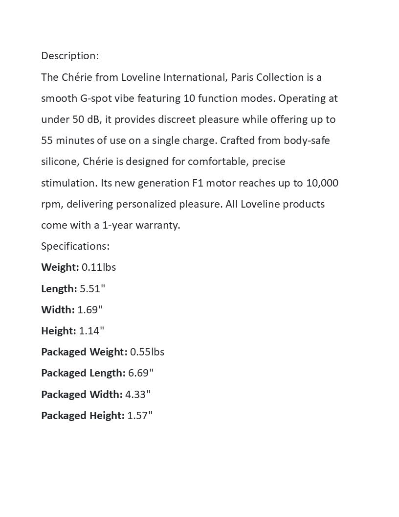 The Chérie from Loveline International, Paris Collection is a smooth G-spot vibe featuring 10 function modes. Operating at under 50 dB, it provides discreet pleasure while offering up to 55 minutes of use on a single charge. Crafted from body-safe silicone, Chérie is designed for comfortable, precise stimulation. Its new generation F1 motor reaches up to 10,000 rpm, delivering personalized pleasure. All Loveline products come with a 1-year warranty.