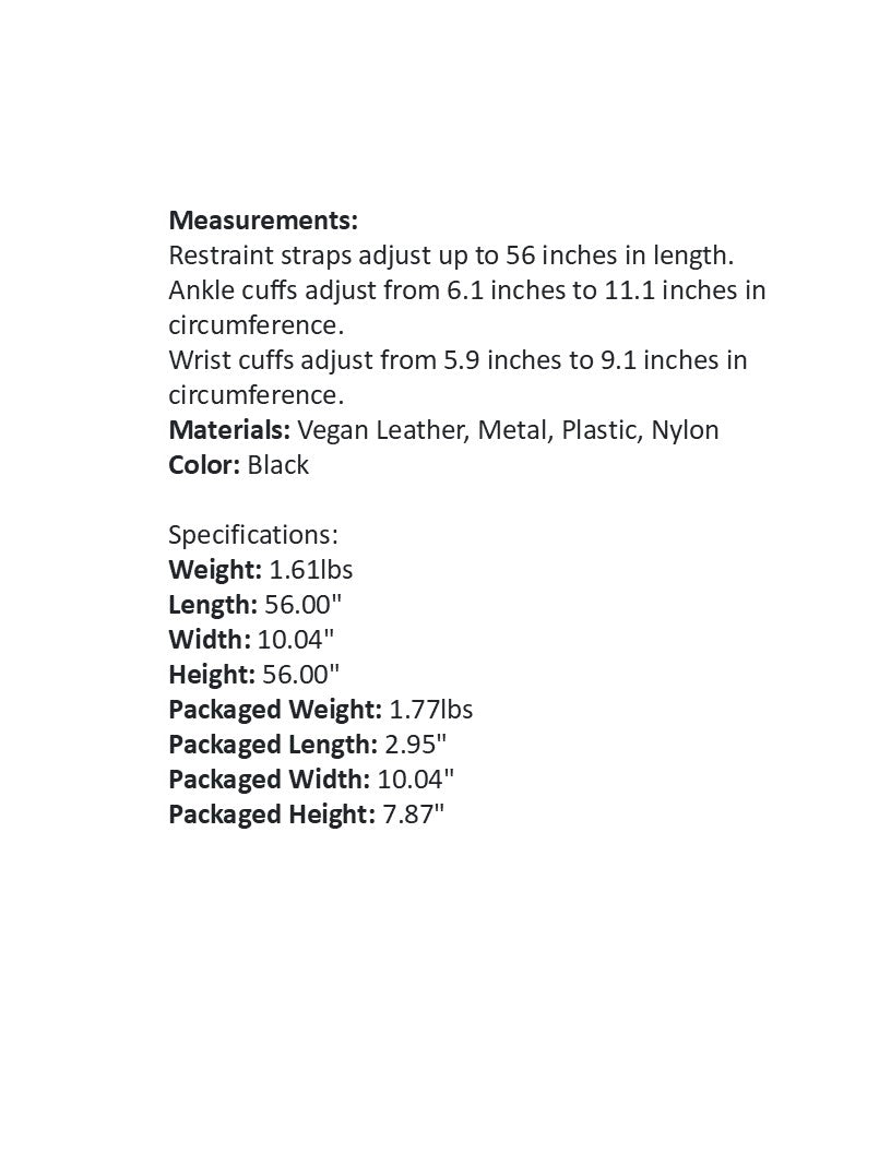 Turn up the heat with this sensual, All Access Bed Restraint Kit. Perfectly balancing comfort and durability, these restraints are made with stylish vegan leather, ideal for those who value ethical choices. Adjustable straps wrap around your bed to keep your partner securely in place while staying suitable for various mattress sizes. With wrist and ankle cuffs tailored for a snug yet cozy fit, this set also features additional foot straps for enhanced stability and safety. Whether you’re exploring new boundaries or revisiting familiar fantasies, this restraint system sets the stage for unforgettable passion.